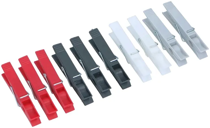 Zestaw uniwersalnych, kolorowych klamerek do suszenia prania. Idealne do używania zarówno na zewnątrz, jak i wewnątrz.
